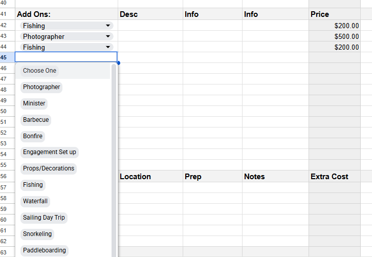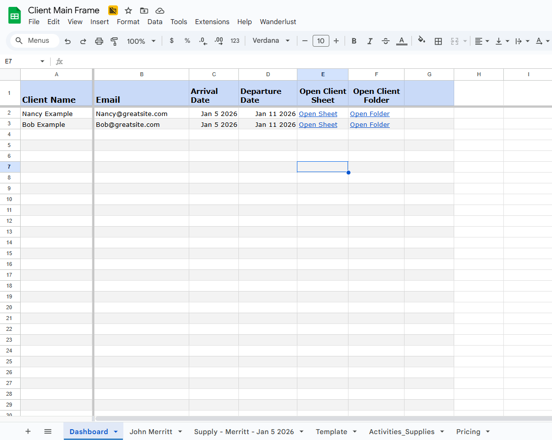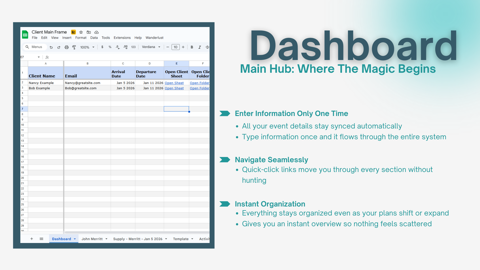 Your dashboard stays updated as you work, displaying active clients, dates, and links to each client’s sheet and folder. Supplies, activities, and add-ons update from your selections automatically.
