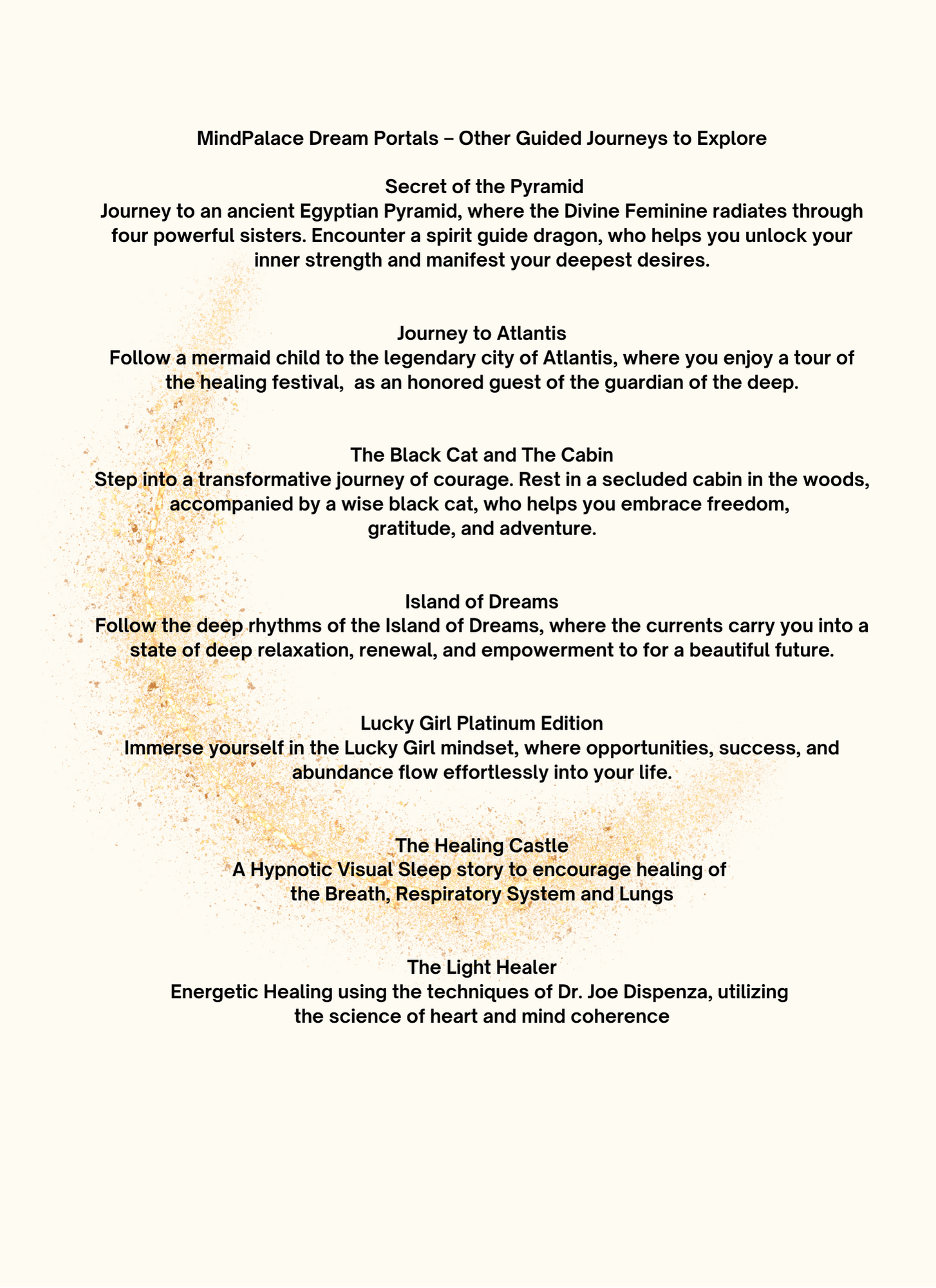 Step inside the sanctuary of your own healing. Healing Castle is a powerful guided journey that blends hypnosis, visualization, and therapeutic metaphor to awaken your body's innate ability to heal.